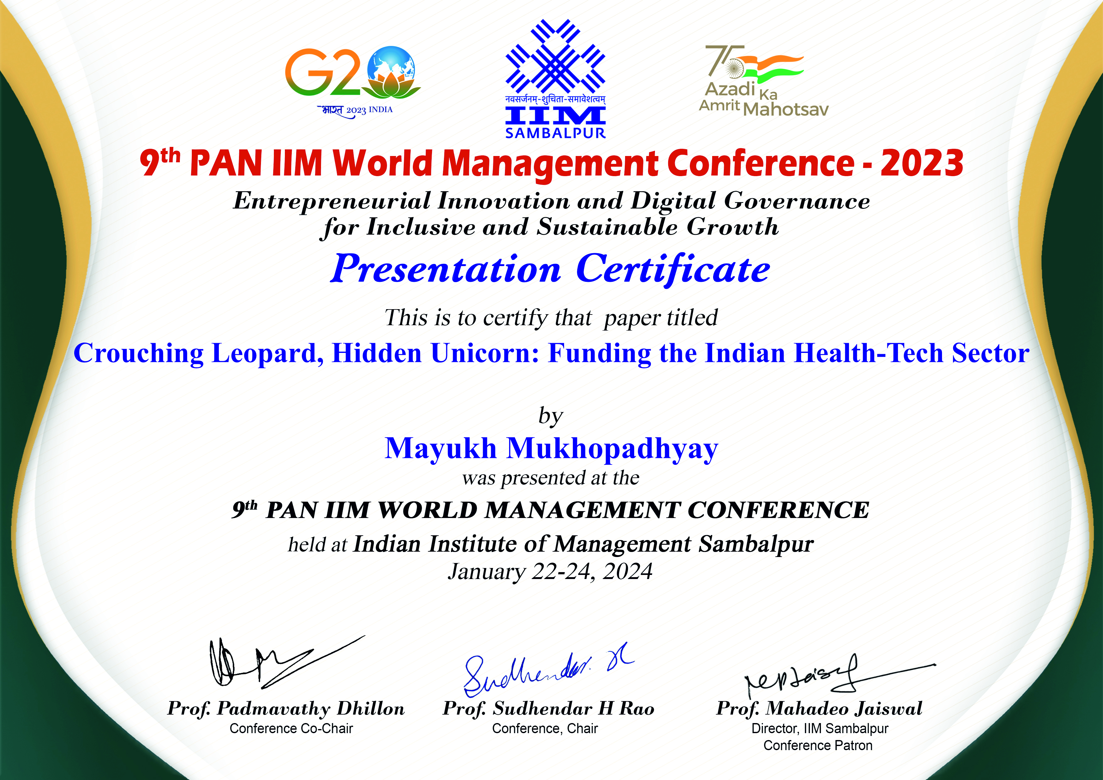 Jan 2024Crouching Leopard, Hidden Unicorn: Funding the Indian Health-Tech Sector9th PAN IIM World Management Conference 2023 · 🔗 Certificate of Presentation